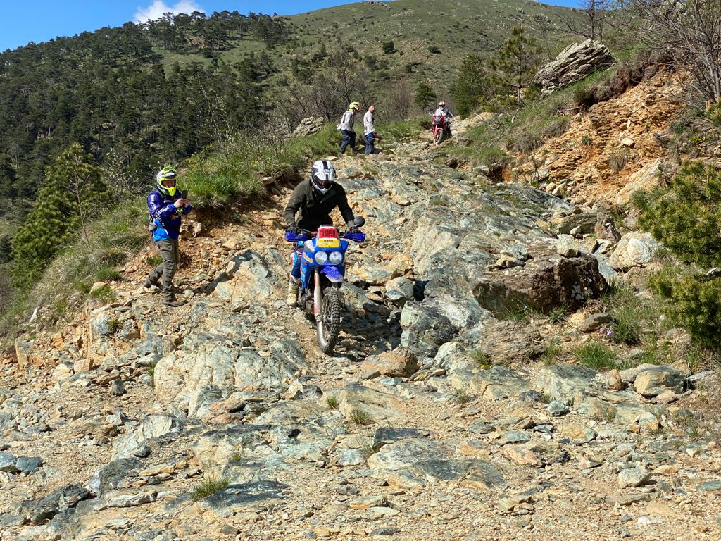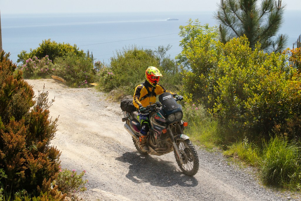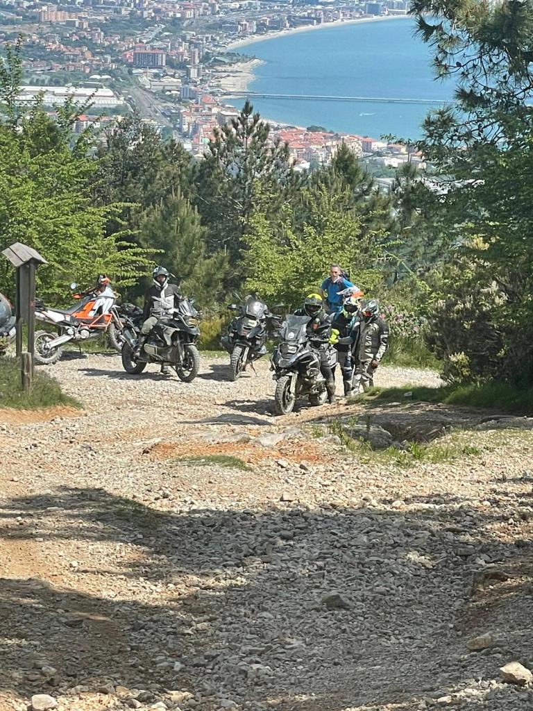 Qui inizia la nostra divertente “disavventura” a causa di un nostro errore nelle tracce sbagliamo strada e ci infiliamo, nostro malgrado, in una pietraia in discesa da circuito dantesco. Già dall’inizio si poteva immaginare che sarebbe finita nel casino, ma come accade spessissimo, non avendo potuto fare scouting del percorso, ci siamo detti …va beh sarà brutta solo all’inizio e poi spiana. Invece no!! sempre peggio e con moto da 200 kg tornare indietro e rifarla in salita era impossibile decidiamo quindi di continuare la discesa verso il mare, sono solo pochi km la traccia GPS che da rosa era diventata rossa dalla rabbia parla chiaro, una decina di tornanti e si intravede lo sterrato a valle.