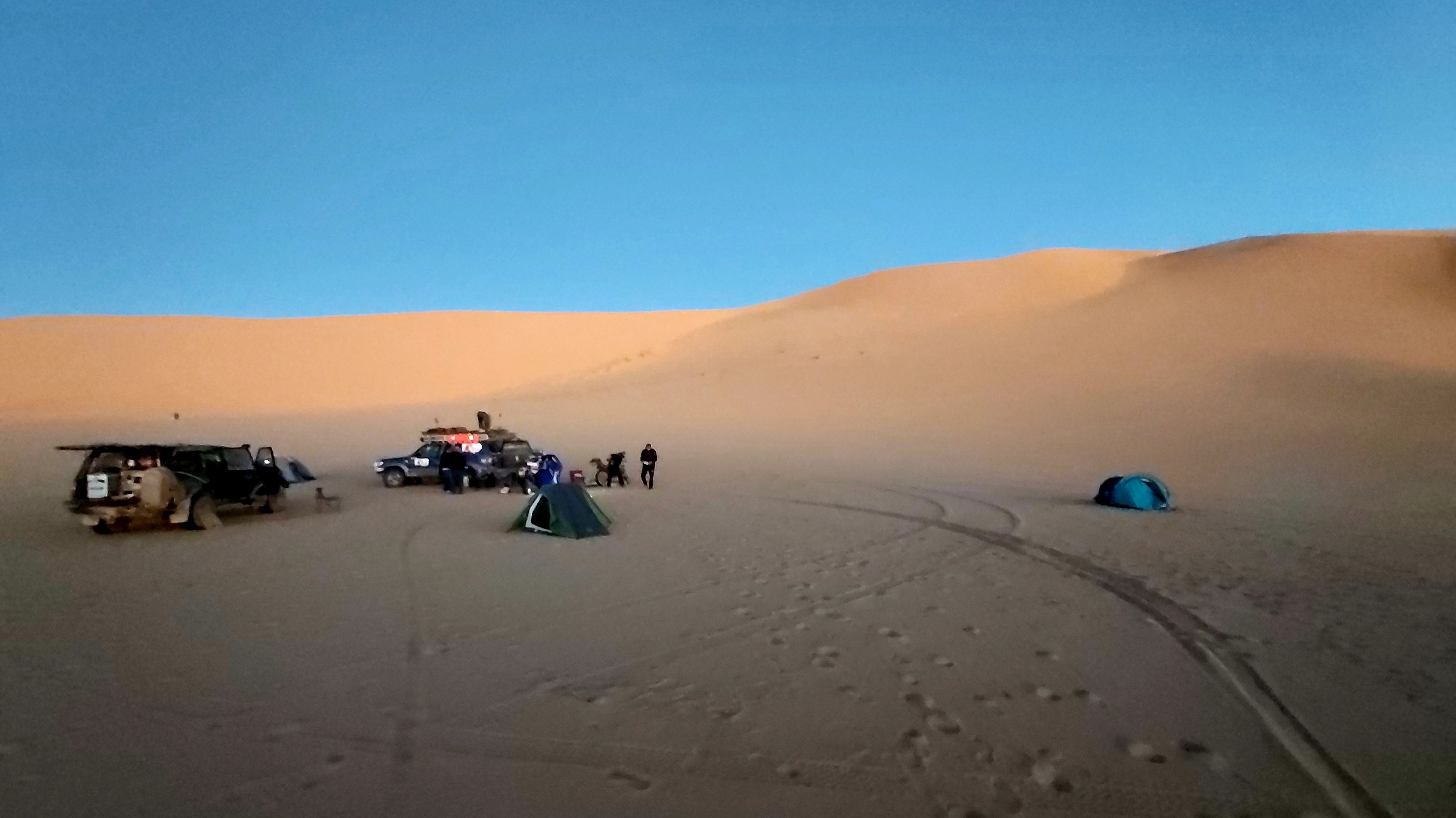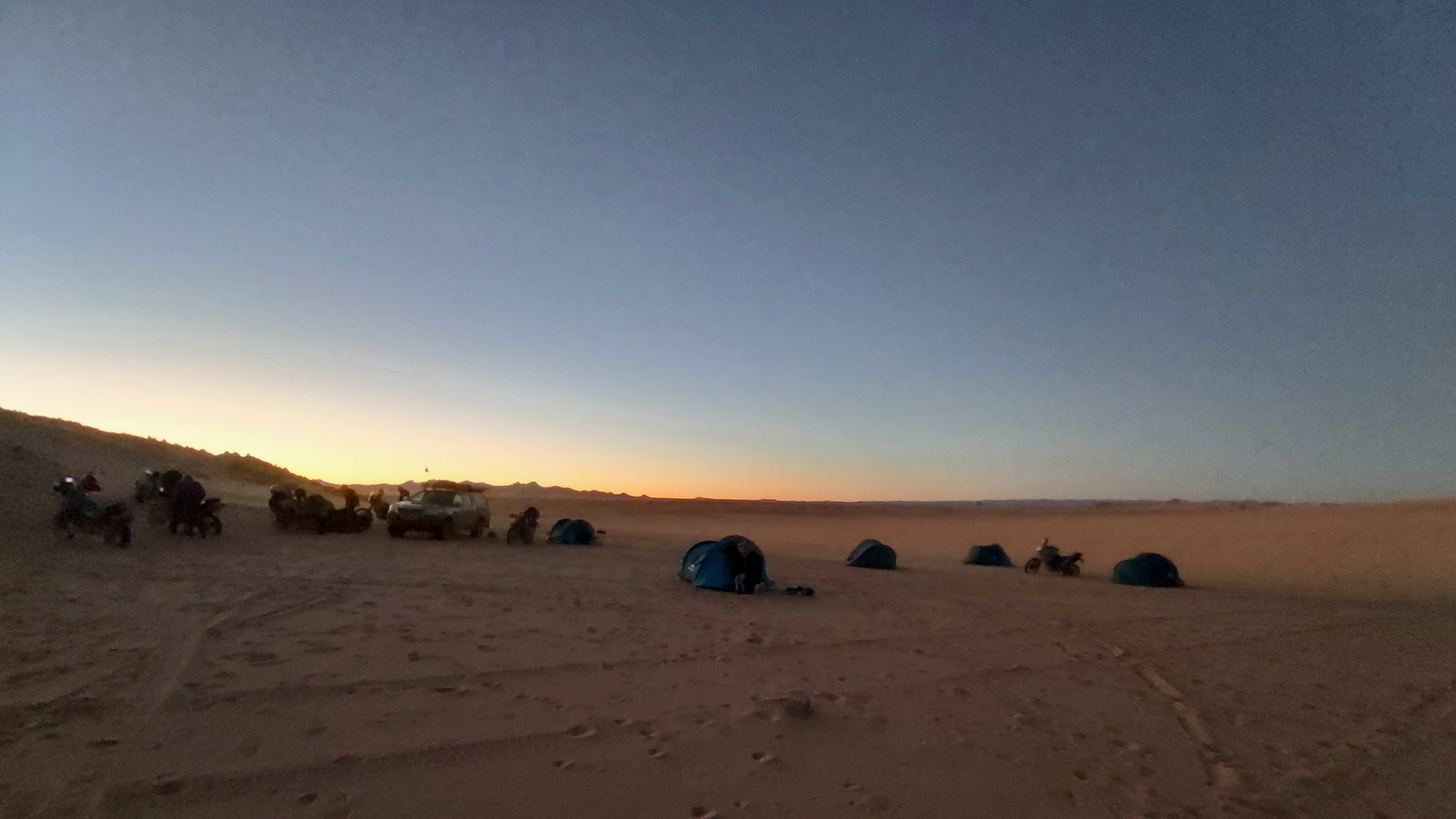 Per quanto la sera fosse calda, la notte è stata gelida ai margini dell’Erg Admer ma svegliarsi con la la vista di un’alba magica rimette subito tutti con umore positivo