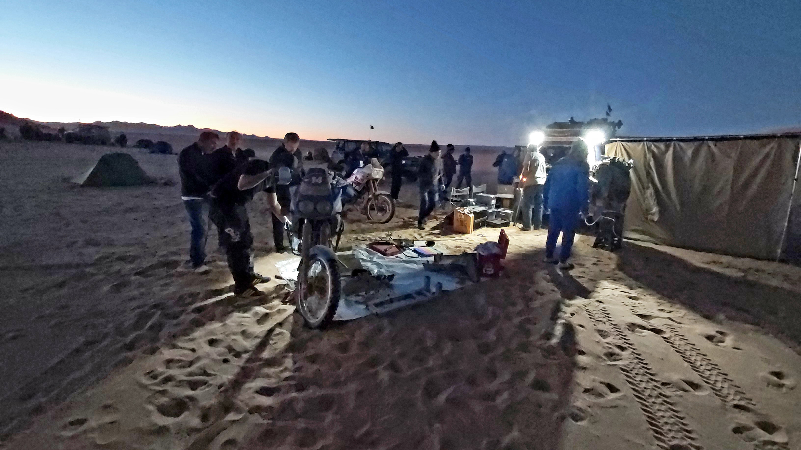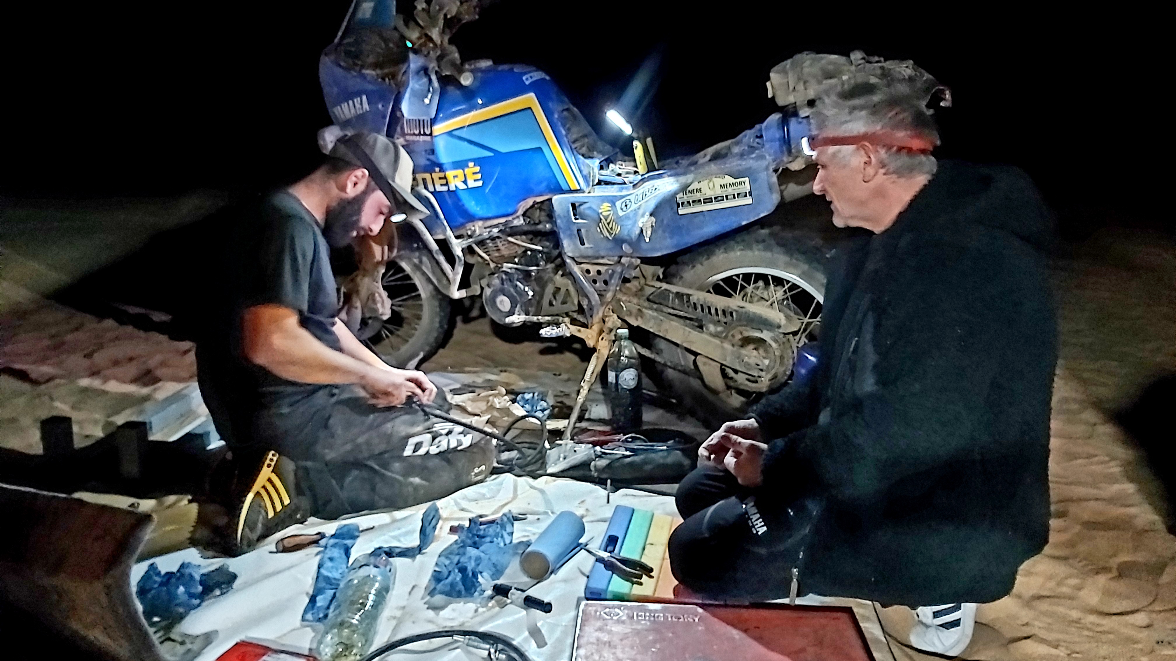 Le moto procedono bene nel divertimento di tutti, per assurdo i 4×4 di Nicolas e Serge hanno un problema meccanico e devono fermarsi a 100 km dal bivacco, una jeep riparte e raggiunge il bivacco fine tappa mentre i motociclisti e parte dell’assistenza stanno già riposando e bivaccando e riscaldandosi intorno al fuoco, l’altra parte del gruppo attende le prime luci dell’alba per ripartire dopo la riparazione.