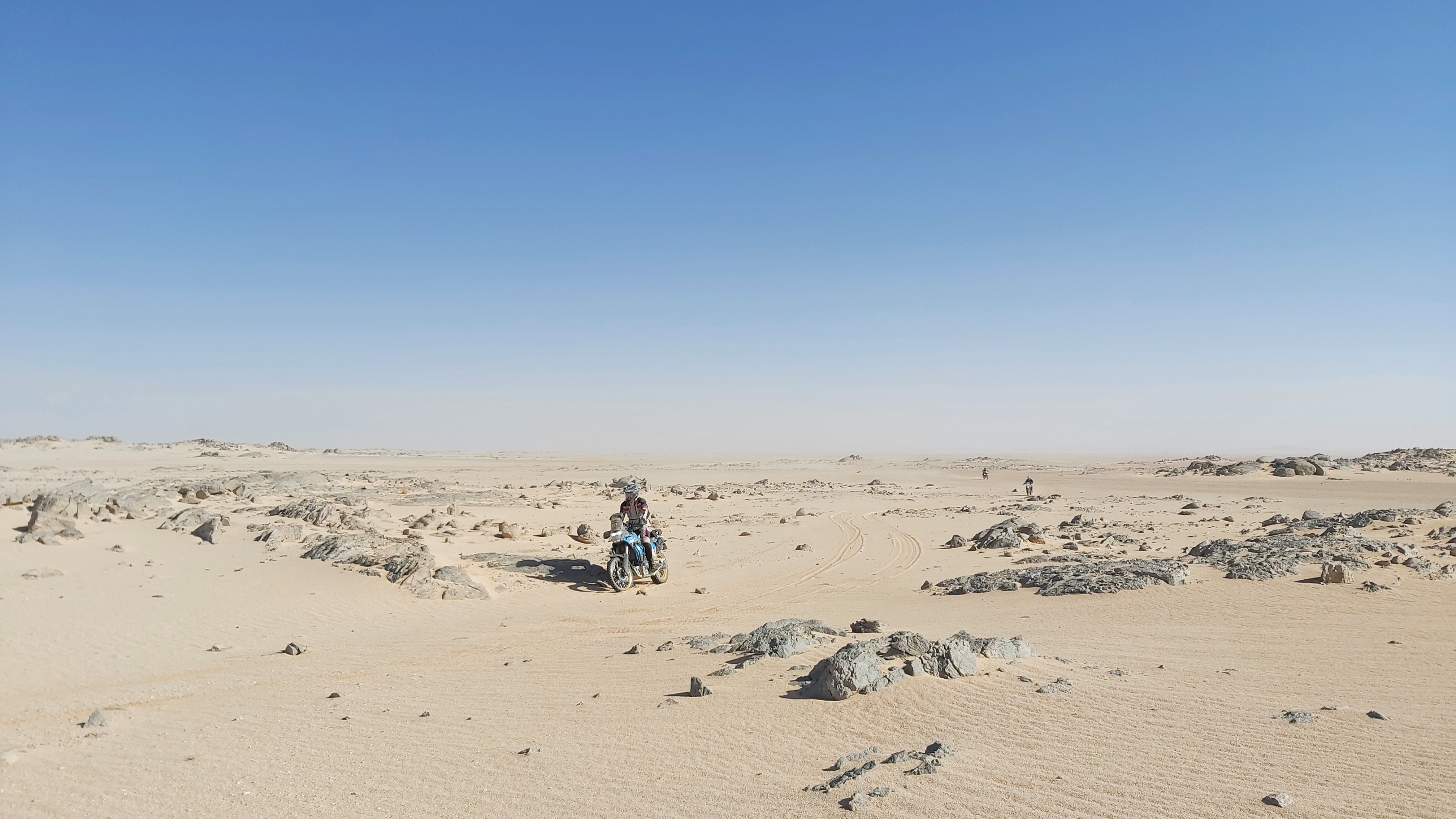Procediamo di buon passo su giganteschi altipiani desertici km e km di sabbia e ciottoli e un orizzonte infinito… che anche grazie alla stanchezza quasi ti ipnotizza ma bisogna sempre tenere alta l’attenzione, il deserto non perdona, ed un sasso a 80km/h può rovinare un sogno, e ci chiediamo come facessero i gladiatori delle Dakar di un tempo ad attraversare questi stessi altopiani a 160 km/h… una pura follia.