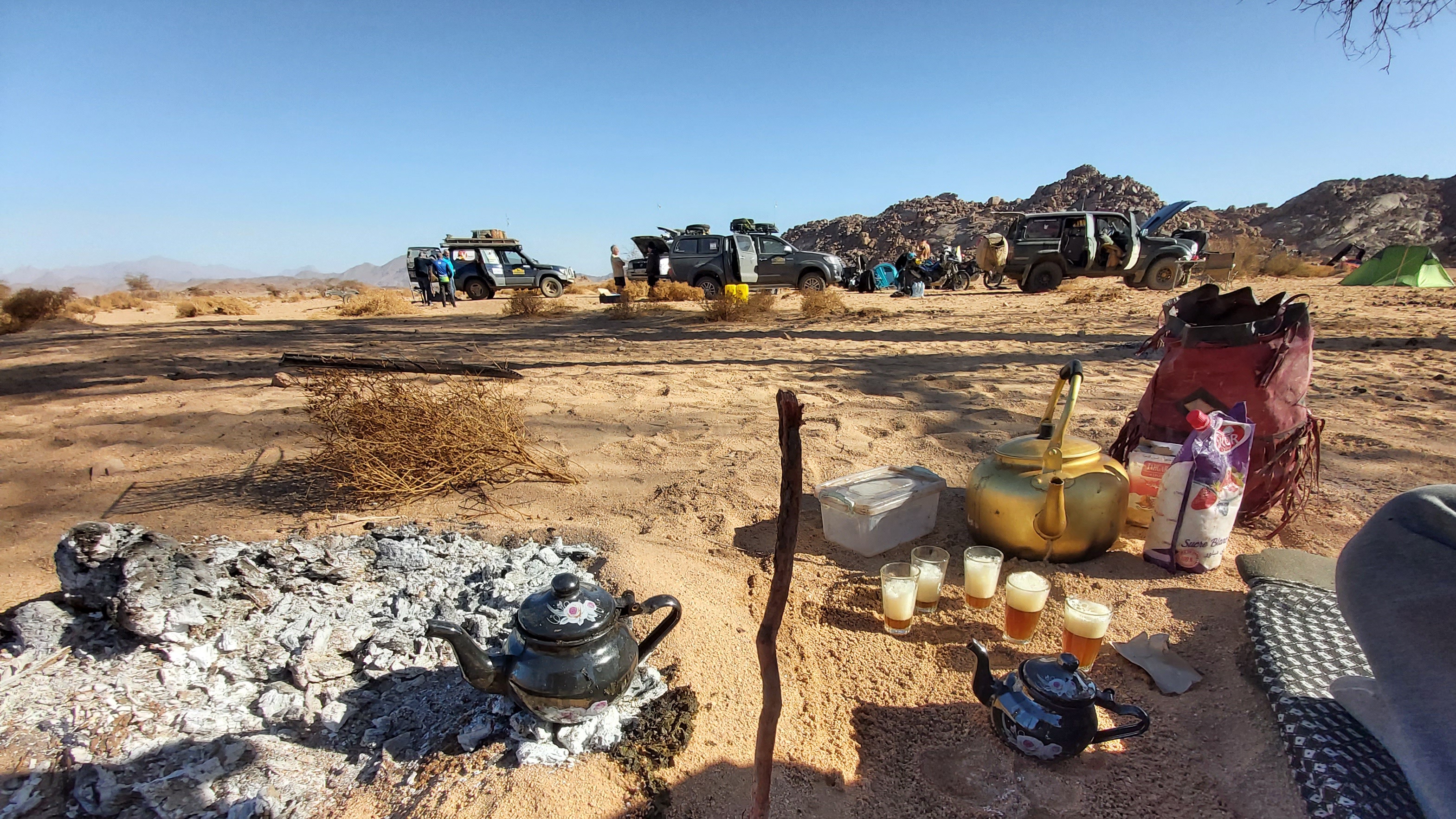 Nonostante tutto, il terreno rimane impegnativo e guidare per 180 km su sabbia soffice e solchi zigzagando tra erba di cammello e rocce non è facile. Raggiungiamo quindi con gioia il bivacco nel primo pomeriggio. Un bivacco allestito in uno straordinario circo roccioso baciato dal sole.
