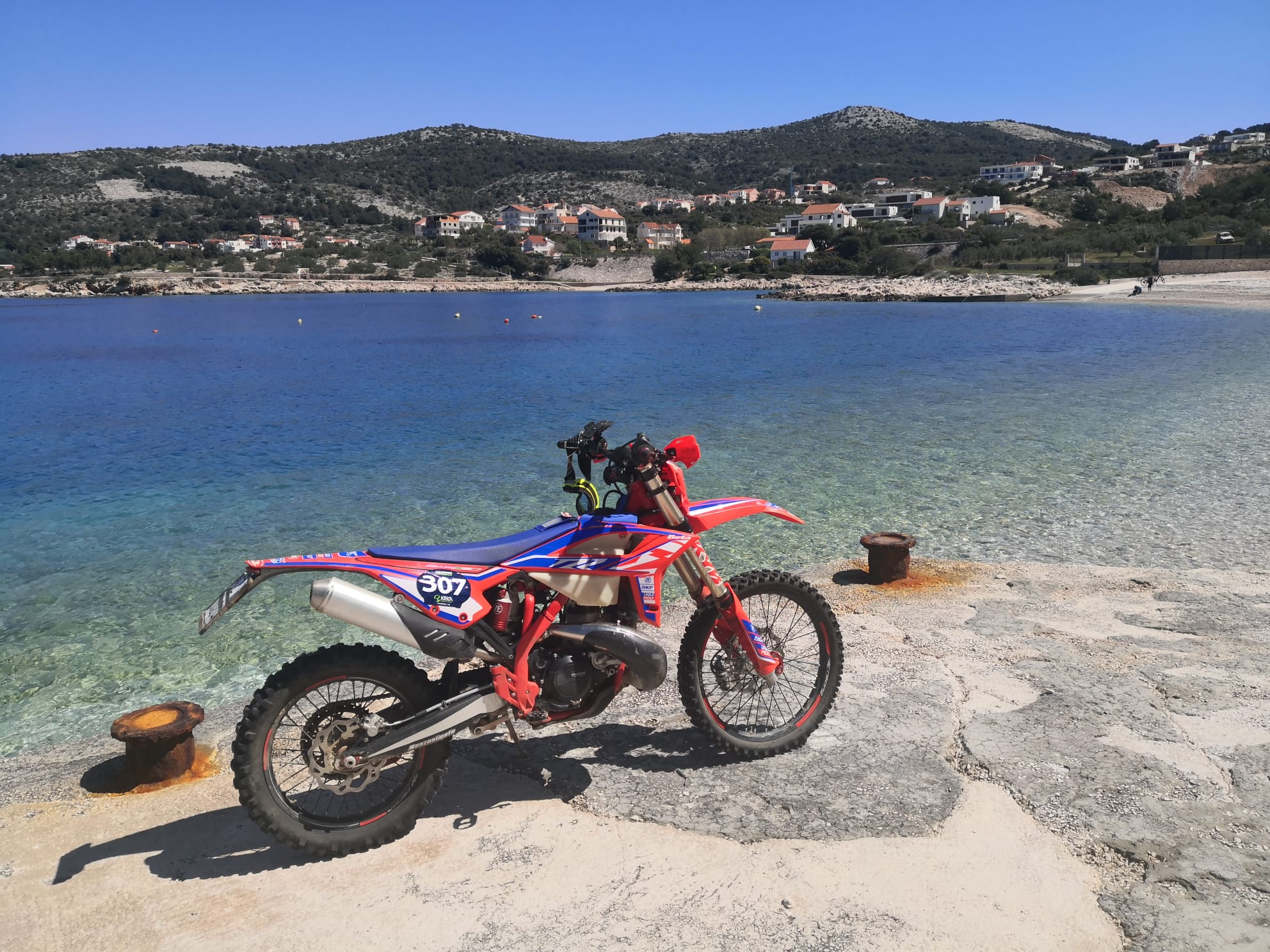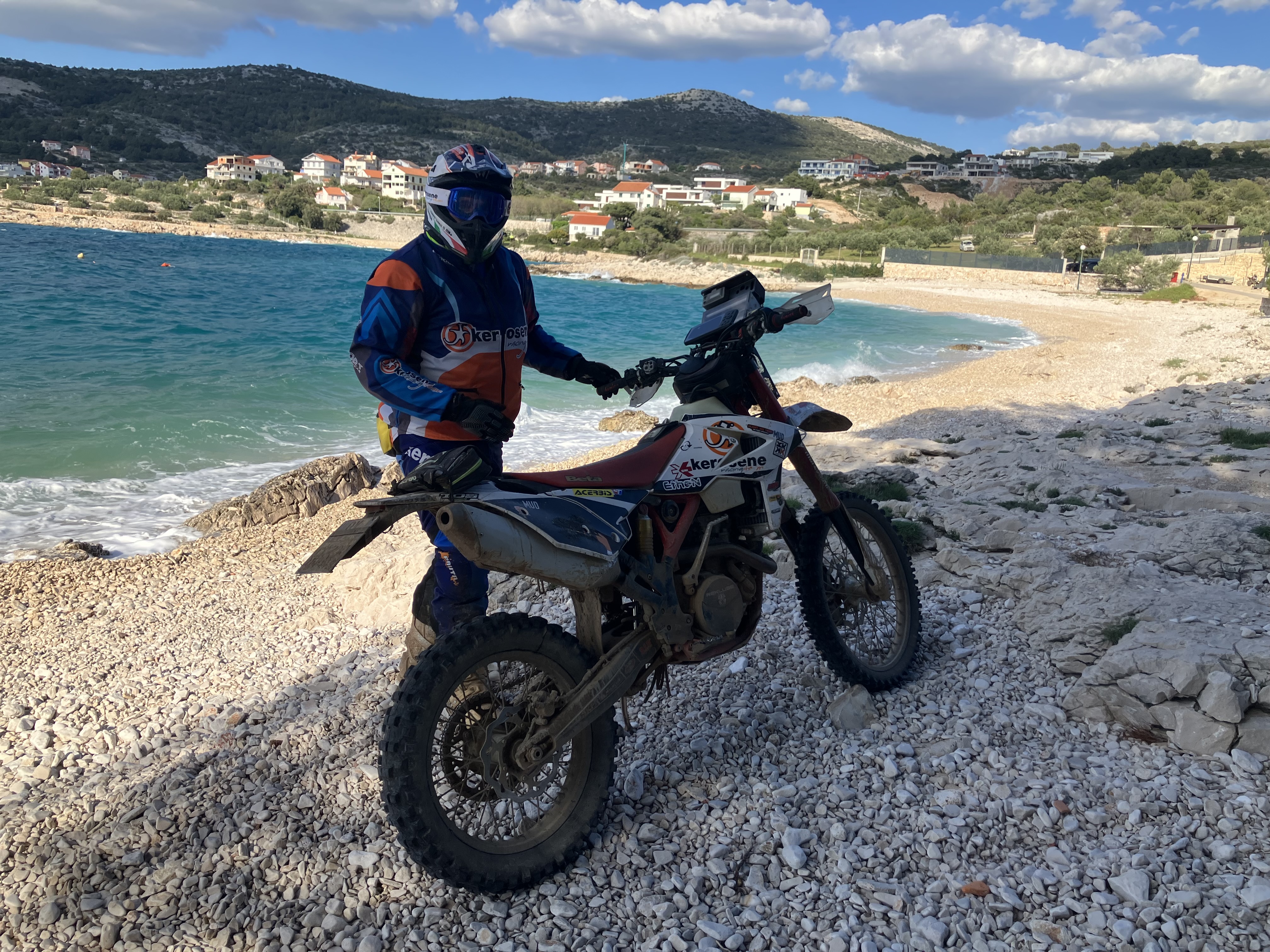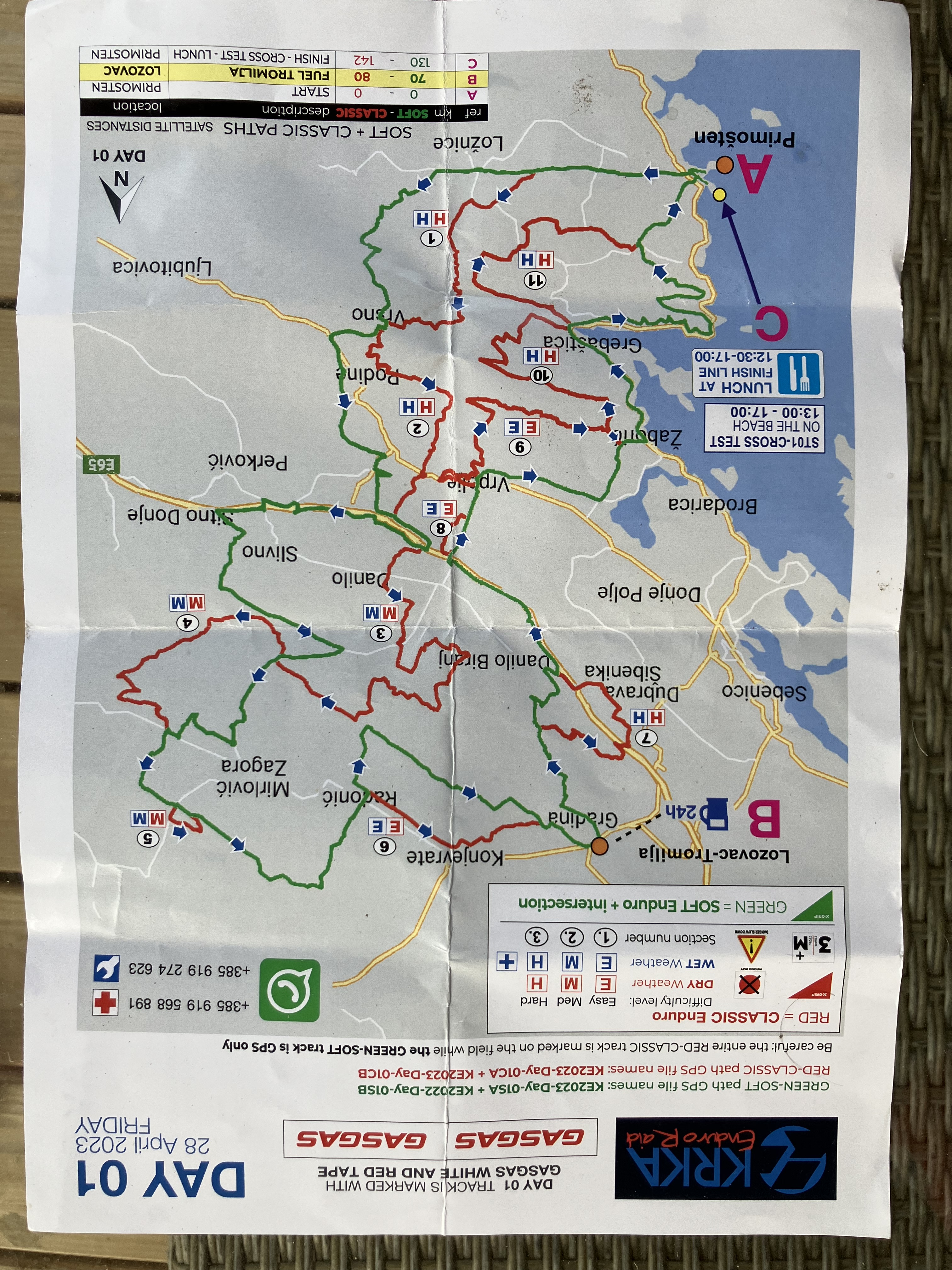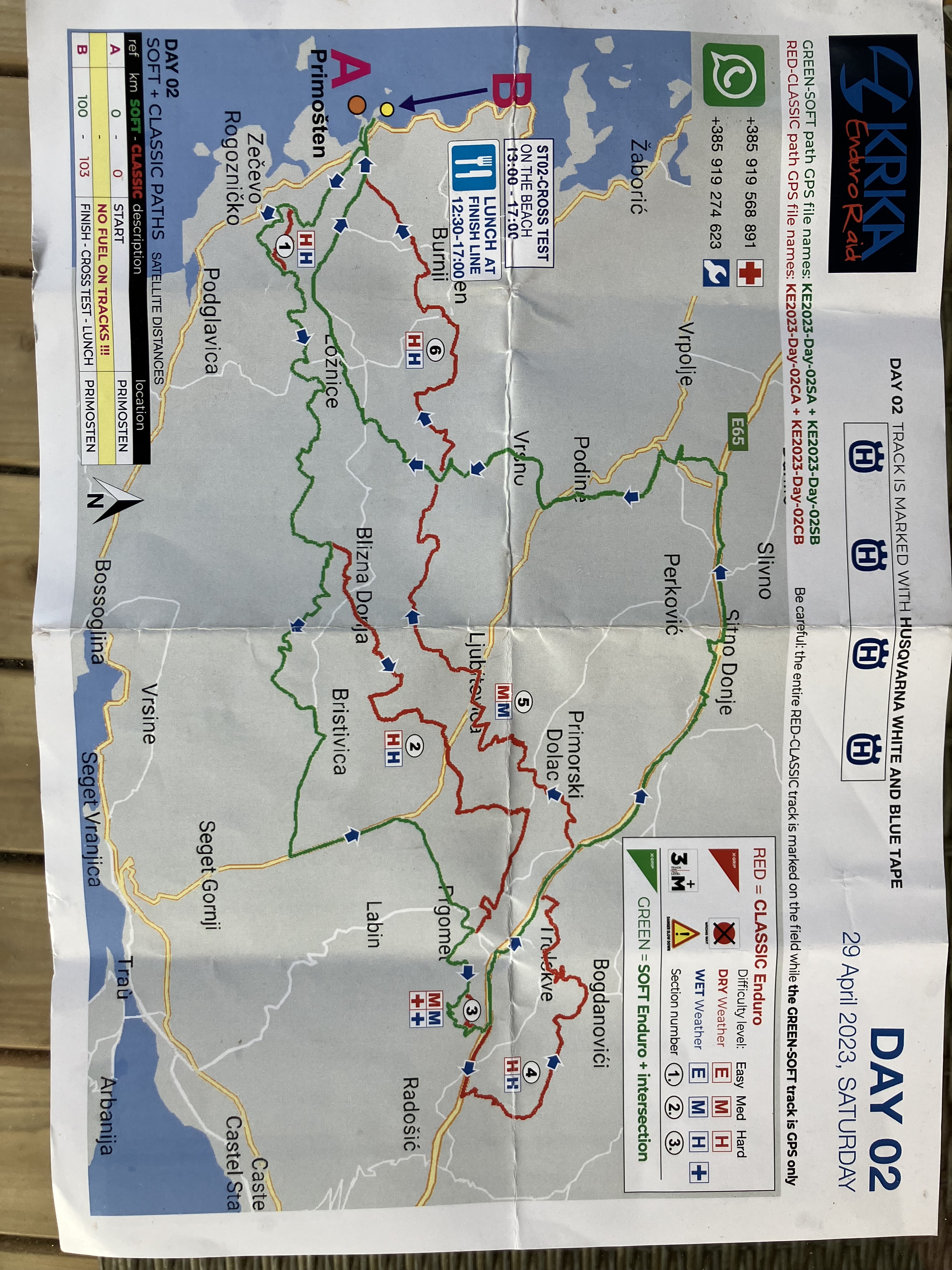 Tutti i percorsi prendono il via dalla piazza centrale di Primosten, si parte seguendo la traccia green easy con Gps per poi proseguire sulle tracce hard rosse a sua volta divise in altre 3 sotto tracce in base alle difficoltà, medium e hard. La sottotraccia H = Hard enduro nella versione più dura risulta facilitata solo dal fatto che non piove ed il terreno si presenta in ottime condizioni, rimane indispensabili una buona gomma extra soft perché le pietraie croate si possono aggredire ed avere buona scorrevolezza solo con mescola adatta all’impervio terreno.