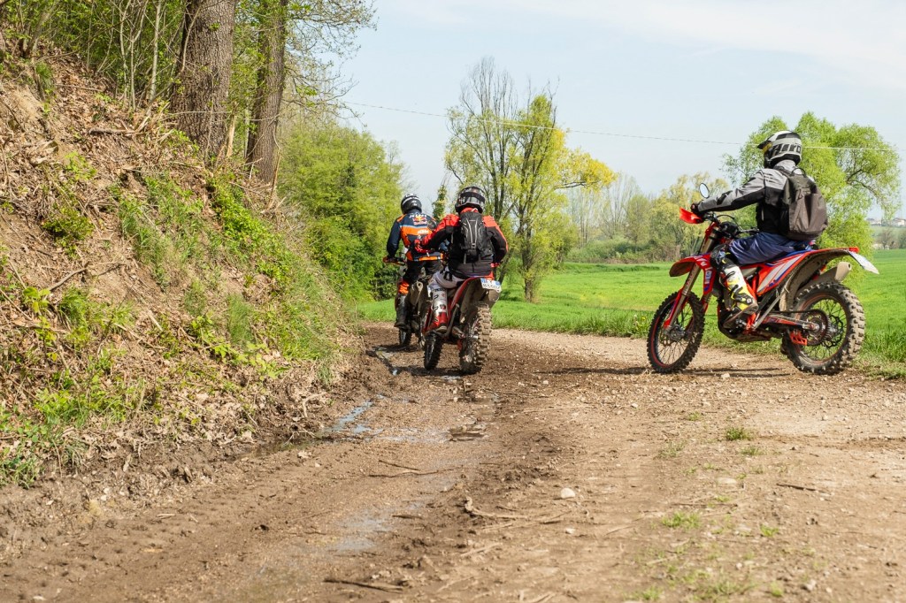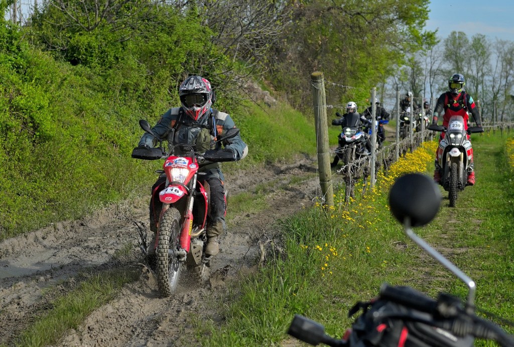 Io come detto parto per ultima quindi attorno alle ore 10 a bordo della mia amata KTM 250 a 4 tempi datami da Motorstore di San Marino,moto alla quale dopo ho installato il roadbook. Ahimè però al sesto km il motorino del roadbook non collabora e scoproche avrei girato tutto a mano il roadbook! Pazienza, fa parte del gioco. Ammetto che questi piccoli imprevisti mi fanno sorridere ed ero contenta perché è come nei viaggi… spesso le cose non sono perfette ma sono stupende proprio per questo. I primi chilometri si percorrono lungo strade di campagna immersi in molteplici vigneti in zone collinari conducendo i piloti nella parte sud del lago, nella zona dell’alto mantovano. I percorsi sono semplici e scorrevoli ma la navigazione è impegnativa vista la grande quantità di bivi e stradine da prendere. Difatti mi trovo subito a rincorrere ovunque persone perse per le campagne ed incontro nel primo pezzo anche il pickup dell’assistenza in soccorso ad un partecipante in panne con il proprio mezzo.