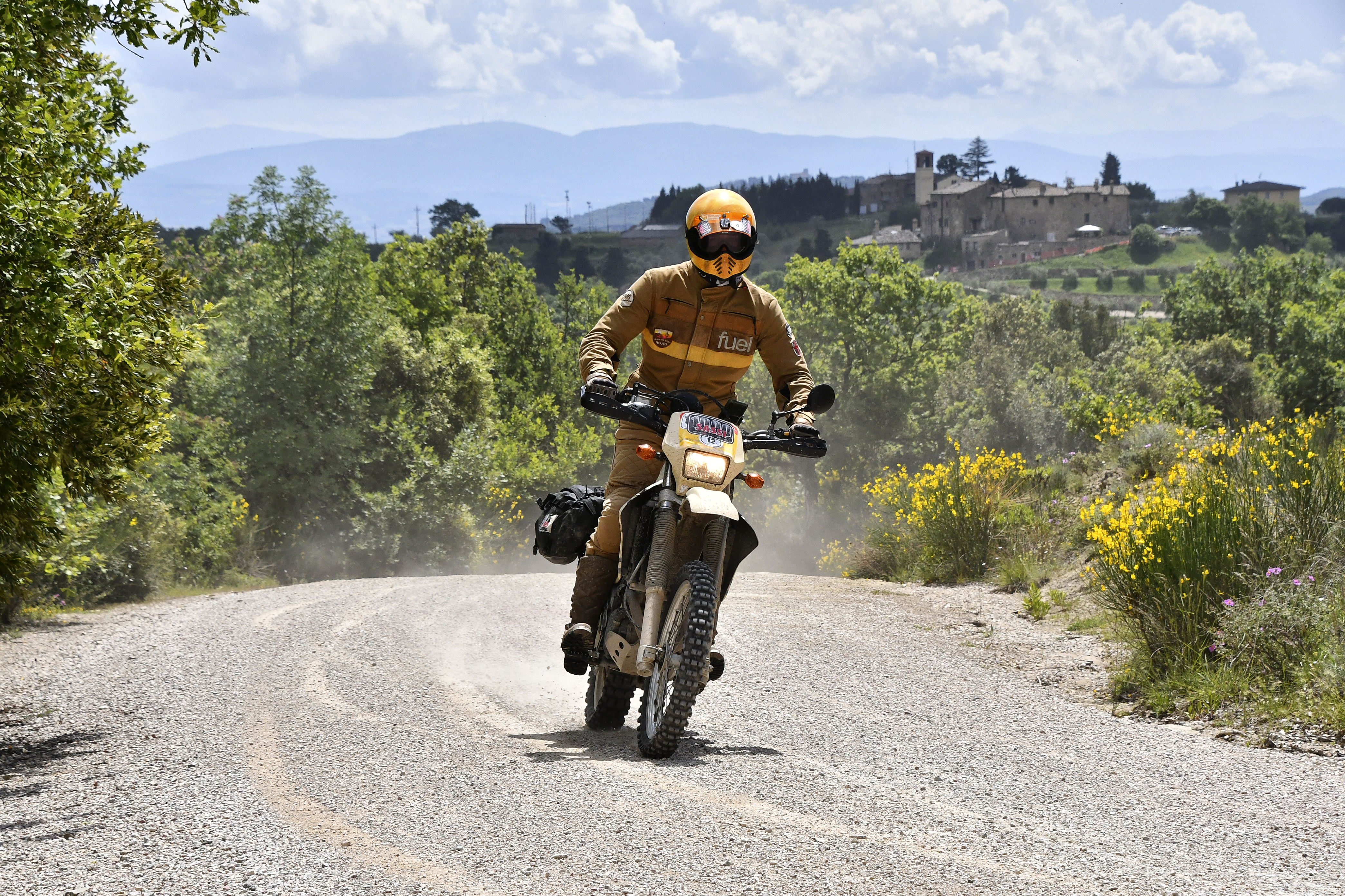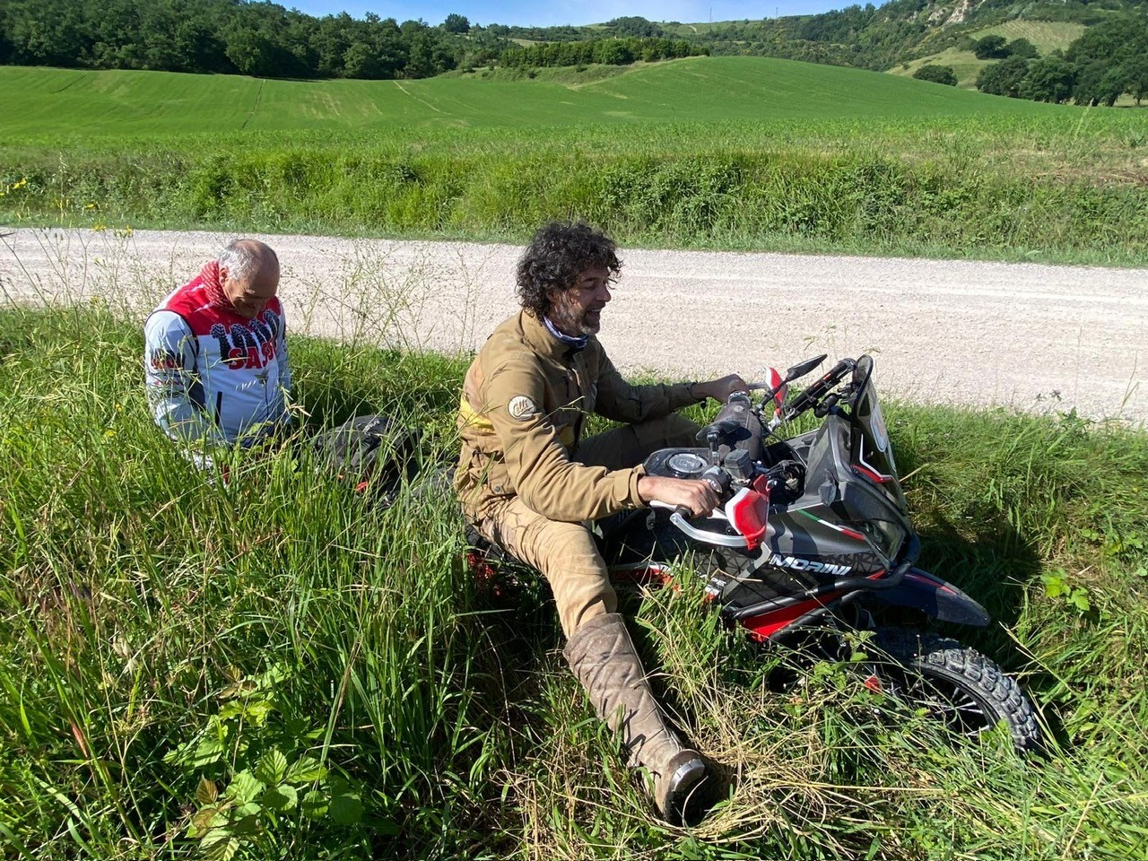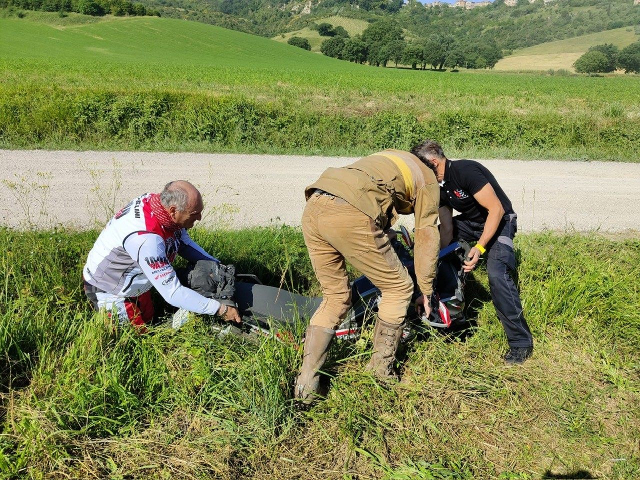Sabato 25 maggio, al via la due giorni, si parte con un inevitabile tratto d’asfalto per uscire dalla città e poi è tutto un susseguirsi di strade bianche di facile percorrenza e con paesaggi incantevoli. Qualche strappetto più complicato prima del ristoro e per noi una variante non prevista in un fosso nel tentativo di assistere Laura Cola di Donne In sella ko con la sua hondina.
