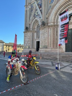 Si prosegue con qualche tratto di asfalto su strade secondarie che rilassa la guida per concludere con ancora un bellissimo sterrato che ci catapulta sulla passerella finale di fine tappa ancora in Piazza del Duomo per poi spostarsi a Piazza del Popolo per il ricco buffet finale e le premiazioni delle moto.