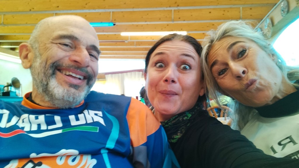 Noi abbiamo seguito la via più “tranquilla”, per goderci appieno il paesaggio, ma le piogge della notte precedente hanno trasformato anche il percorso semplice in una vera avventura: prati fangosi come paludi, pietroni viscidi, tratti asfaltati lucidi come ghiaccio. L’aria frizzante e il cielo terso, però, rendono ogni sforzo piacevole e ogni metro conquistato una piccola vittoria.