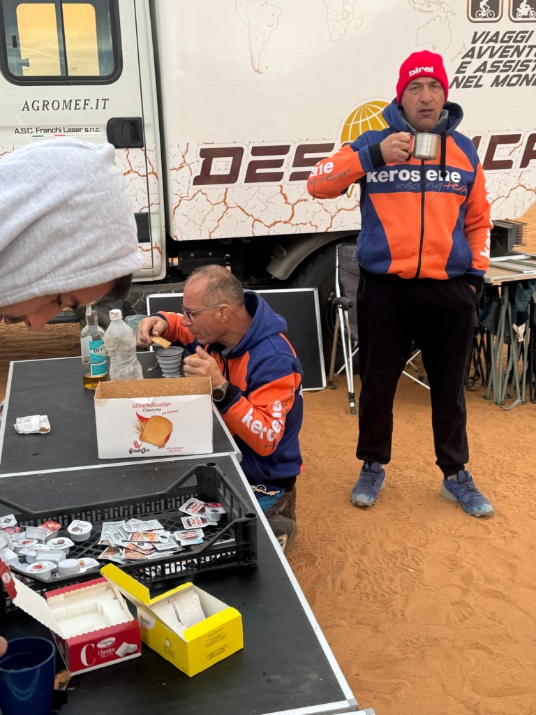 Un piccolo miracolo quotidiano reso possibile dalla straordinaria macchina logistica che supporta ogni tappa. È come sedersi a tavola in famiglia, ma con le dune come pareti e il cielo come tetto.