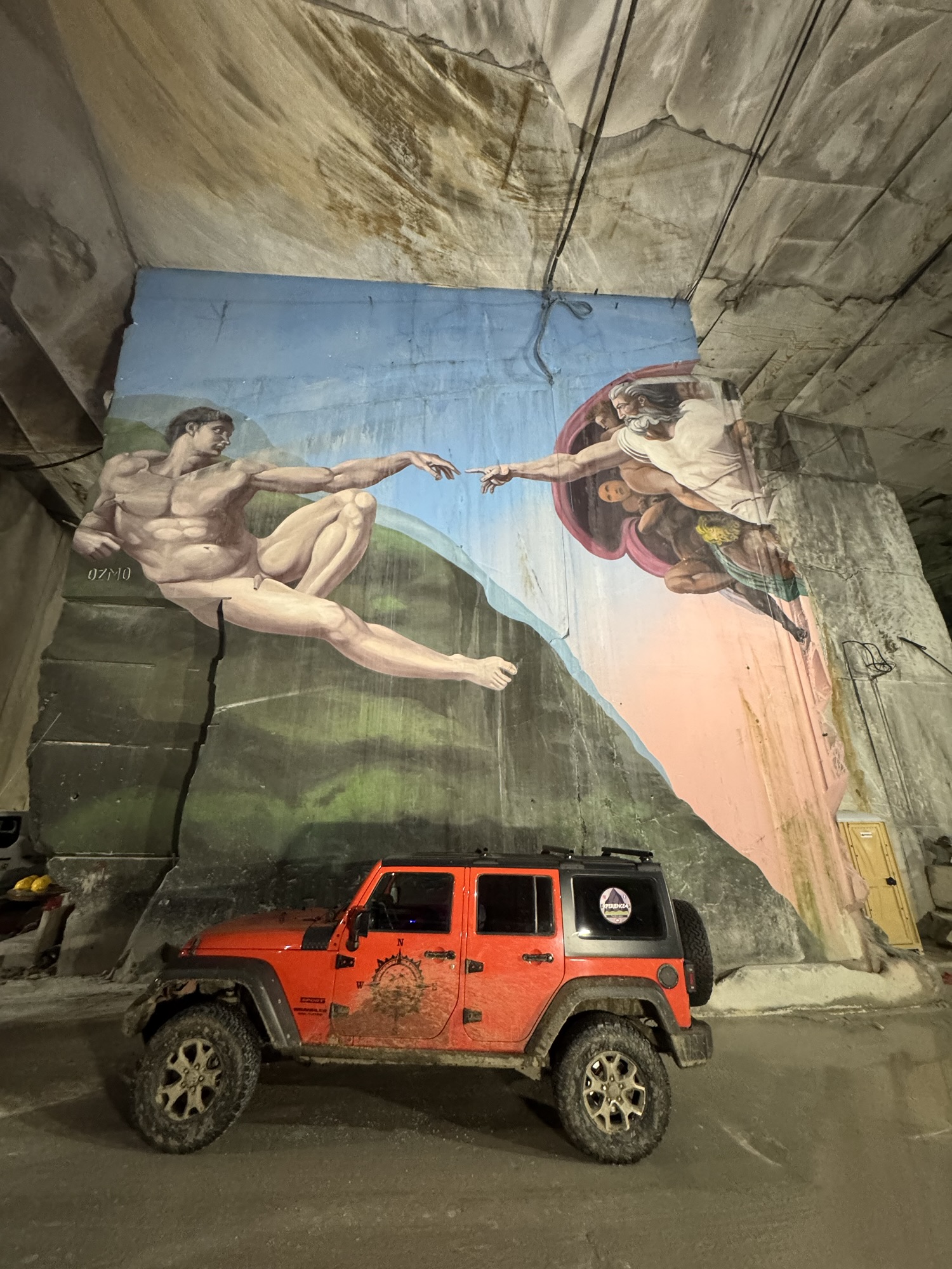 Si prosegue incolonnati, nel frattempo le macchine sono diventate 27, e la lunga colonna con un breve trasferimento su asfalto raggiunge le Cave di Marmo di Carrara; prima sosta per foto, caffè ed assaggio del famoso lardo di Colonnata, nella scenografica località di Ponti di Vara, nel bacino centrale di Miseglia, il più grande dei tre (chiamato, appunto, Canalgrande).