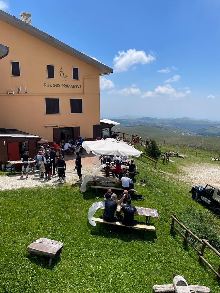 A seguire affrontiamo una splendida strada tutta a curve e tornanti stretti che dopo qualche km ci riporta ad un ‘altrettanto splendido e veloce sterrato in quota che dopo una decina di km consegna al gruppo dei 150 partecipanti la vista del rifugio Primaneve, magari ci fosse stata, perché anche a 1300 mt faceva ancora un gran caldo.